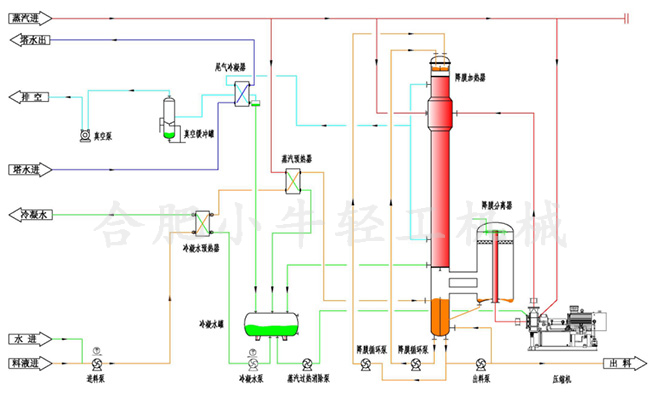 降膜蒸發(fā)器的料液是從蒸發(fā)器的頂部加入,在重力作用下沿管壁成膜狀下降,并在通過加熱管的過程中被蒸發(fā)增濃,在其底部得到濃縮液。MVR降膜蒸發(fā)器將加熱器的產(chǎn)生的二次蒸汽通過壓縮機的絕熱壓縮,能量進行壓縮提升,使其壓力、溫度提高后,再作為加熱蒸汽送入蒸發(fā)器的加熱室,冷凝放熱,使其對這壓縮過后的二次蒸汽加以利用,將其二次蒸汽內(nèi)部潛熱進行回收。因二次蒸汽的潛熱得到了回收利用,所以該設備具有節(jié)省能耗的顯著特點。